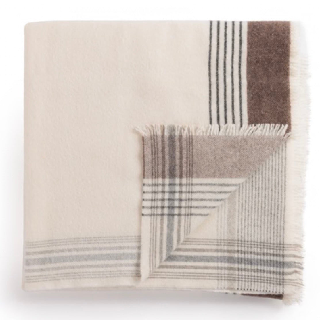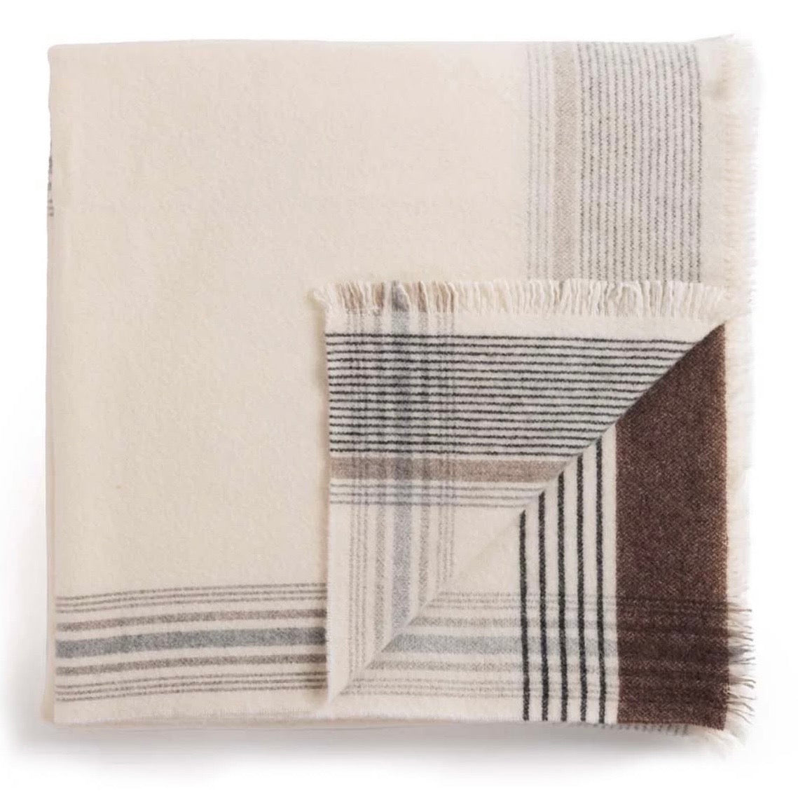 Tæppet er i off white og lyse brune naturfarver og har forskellige kombinationer af farver og striber på hver sin side. Det måler 130 x 180 cm og er vævet af 90% wool 10% cashmere.