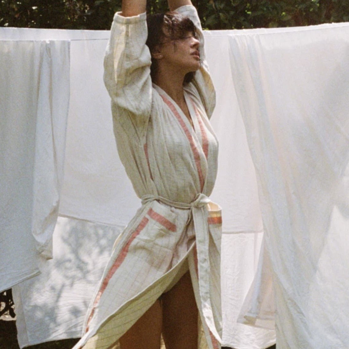 Badekåbe i luksuriøs hurtigttørrende blanding af økologisk bomuld og hør. Det smukke tekstil er håndvævet på århundrede gamle væve og lavet til at holde hele livet.