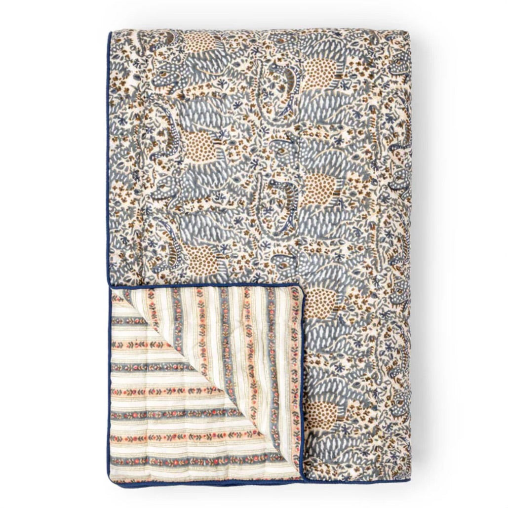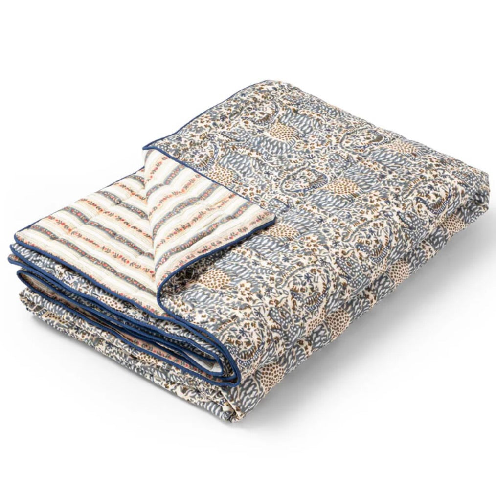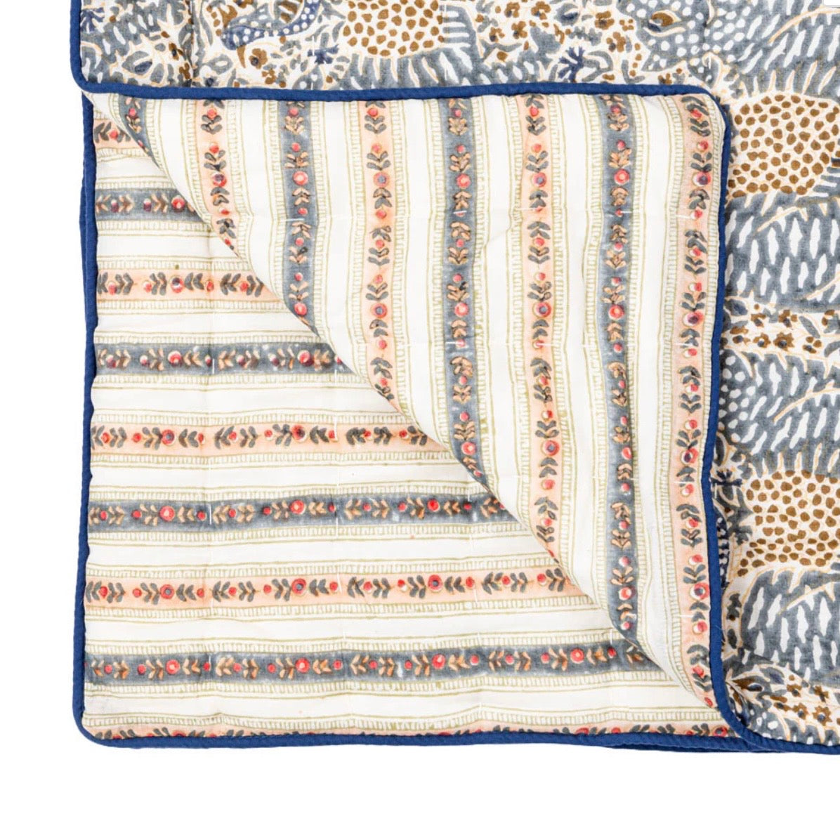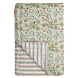 Charmerende quiltet vattæppe, med foreksllige smukke printes på hver side med blomsterstriber på den ene side og et Liberty-print på den anden side i skønne sarte grønne, peach og hindbær toner