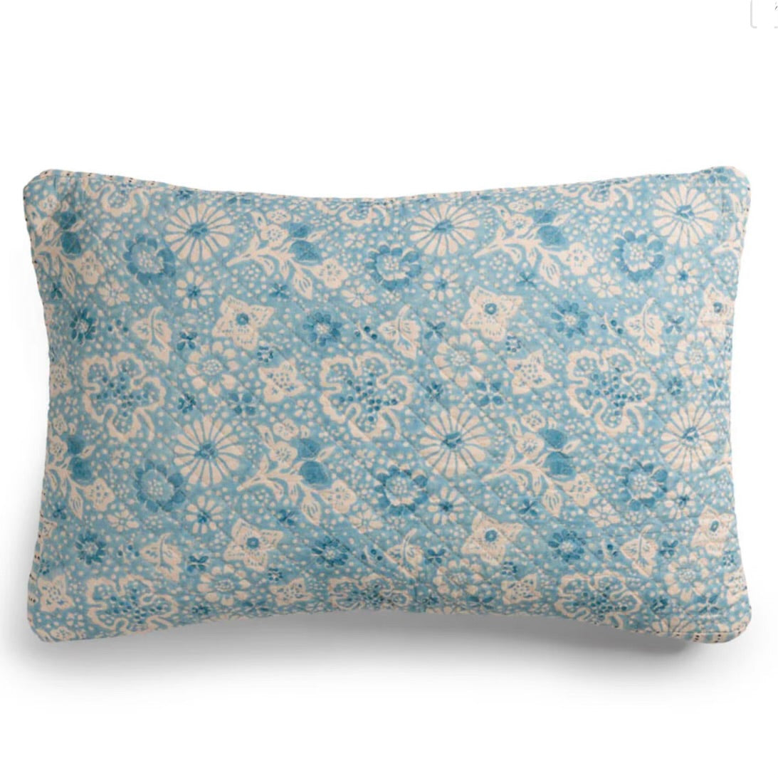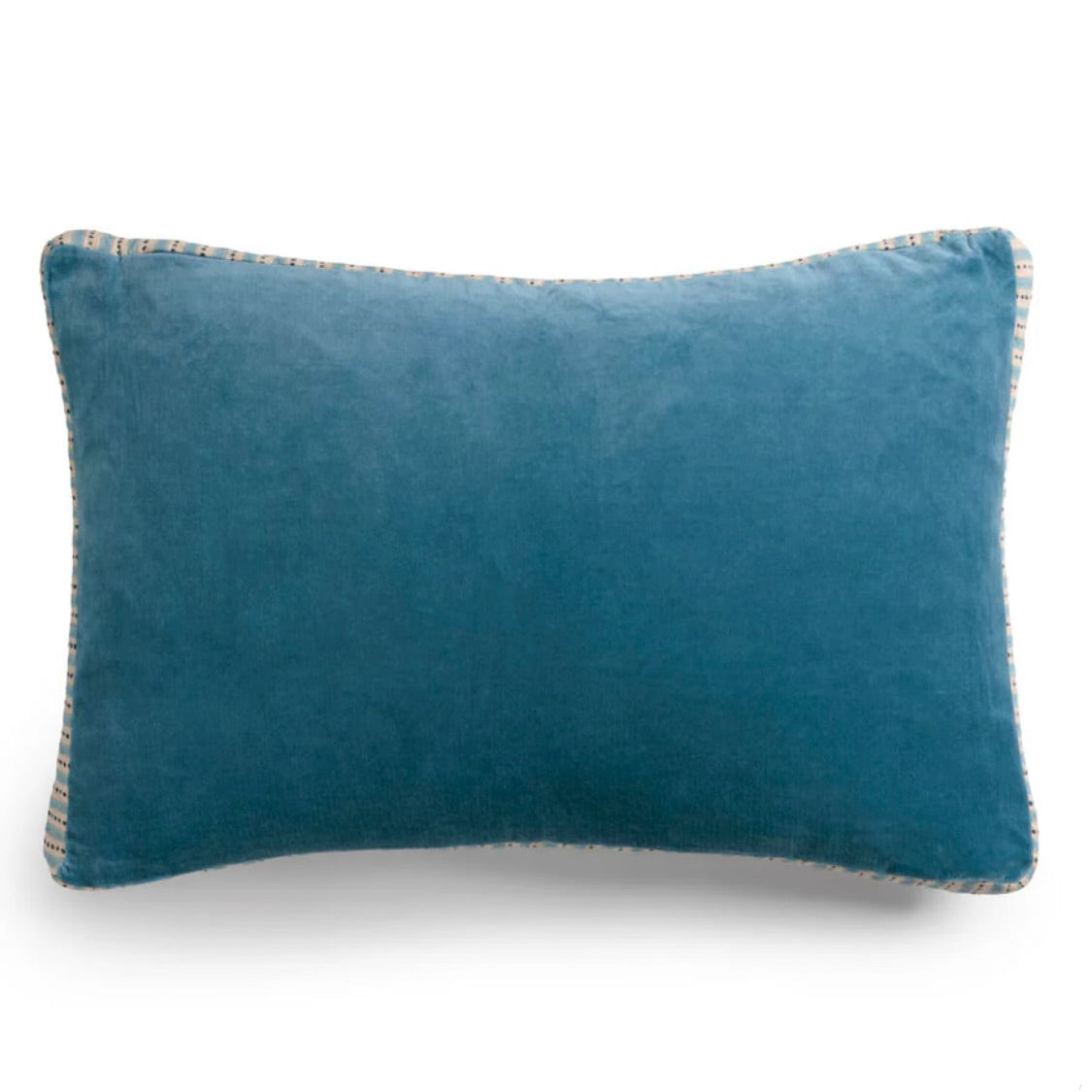Trés chic. Yuki Sifnos pude er vendbar. På den ene side en lækker bomuld i enkelt blomstret mønster i lyse blå toner og på den anden side en lækker tyrkisblå velour. Puden har en elegant kant i blokprint. En yderst eksklusiv pude fra Le Monde Sauvage.