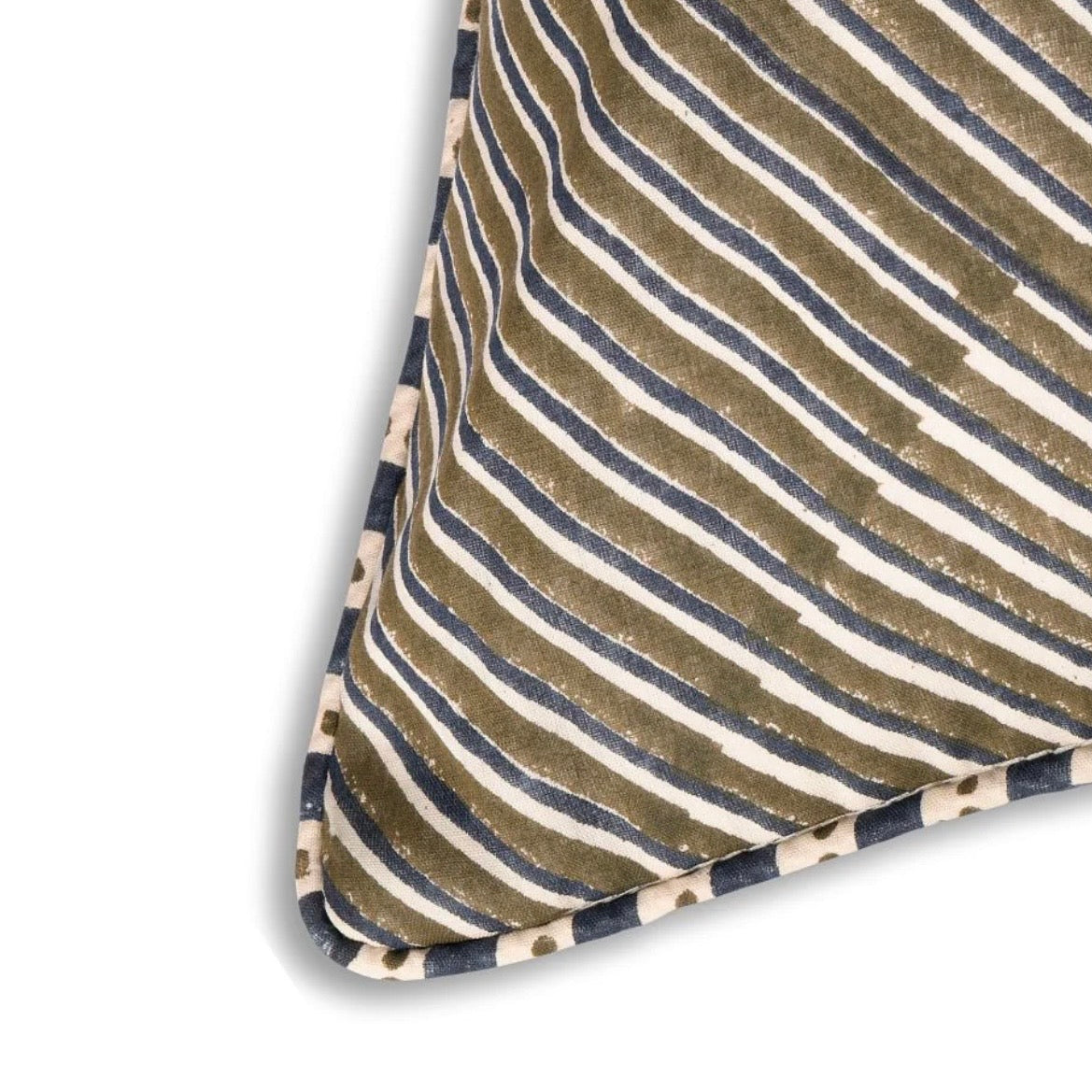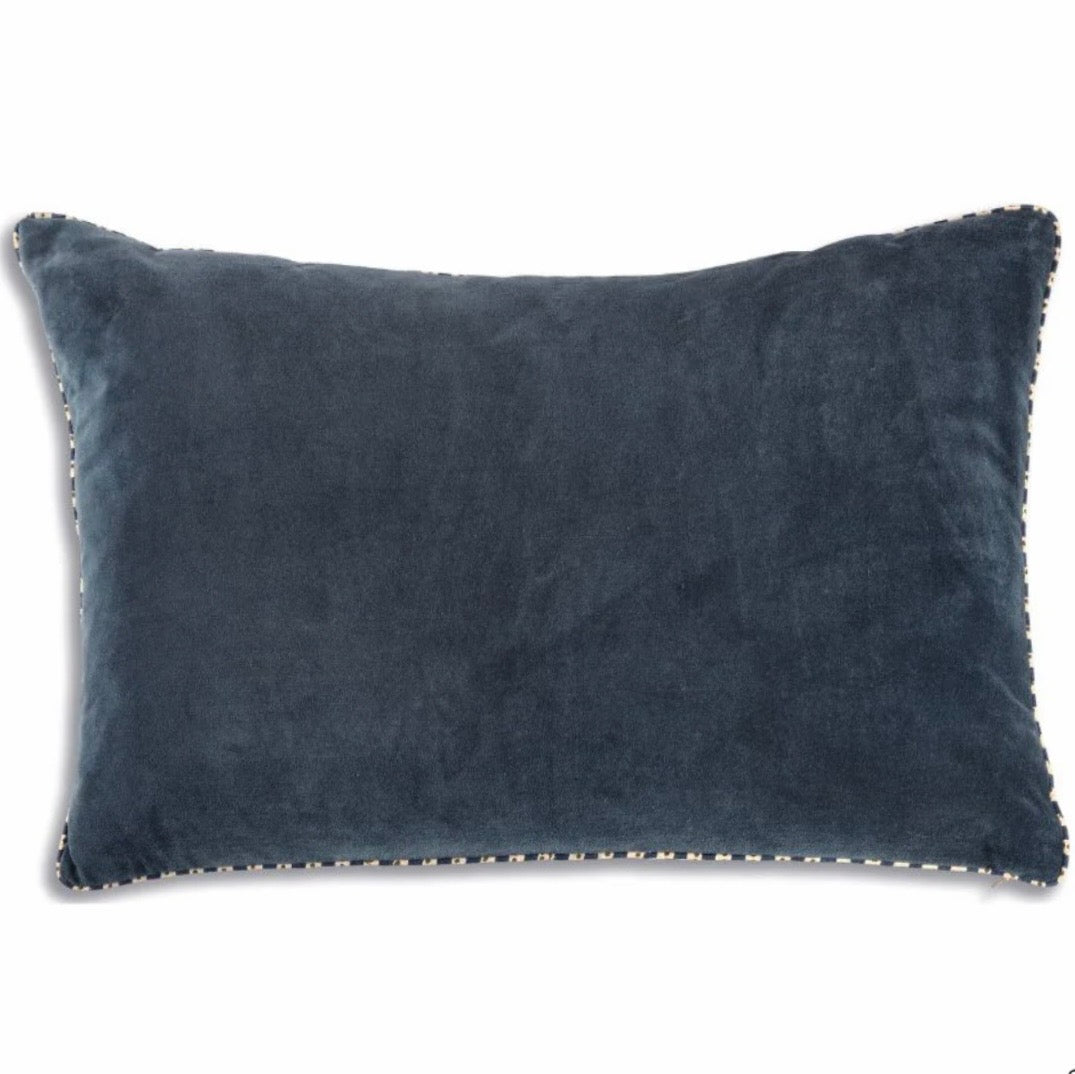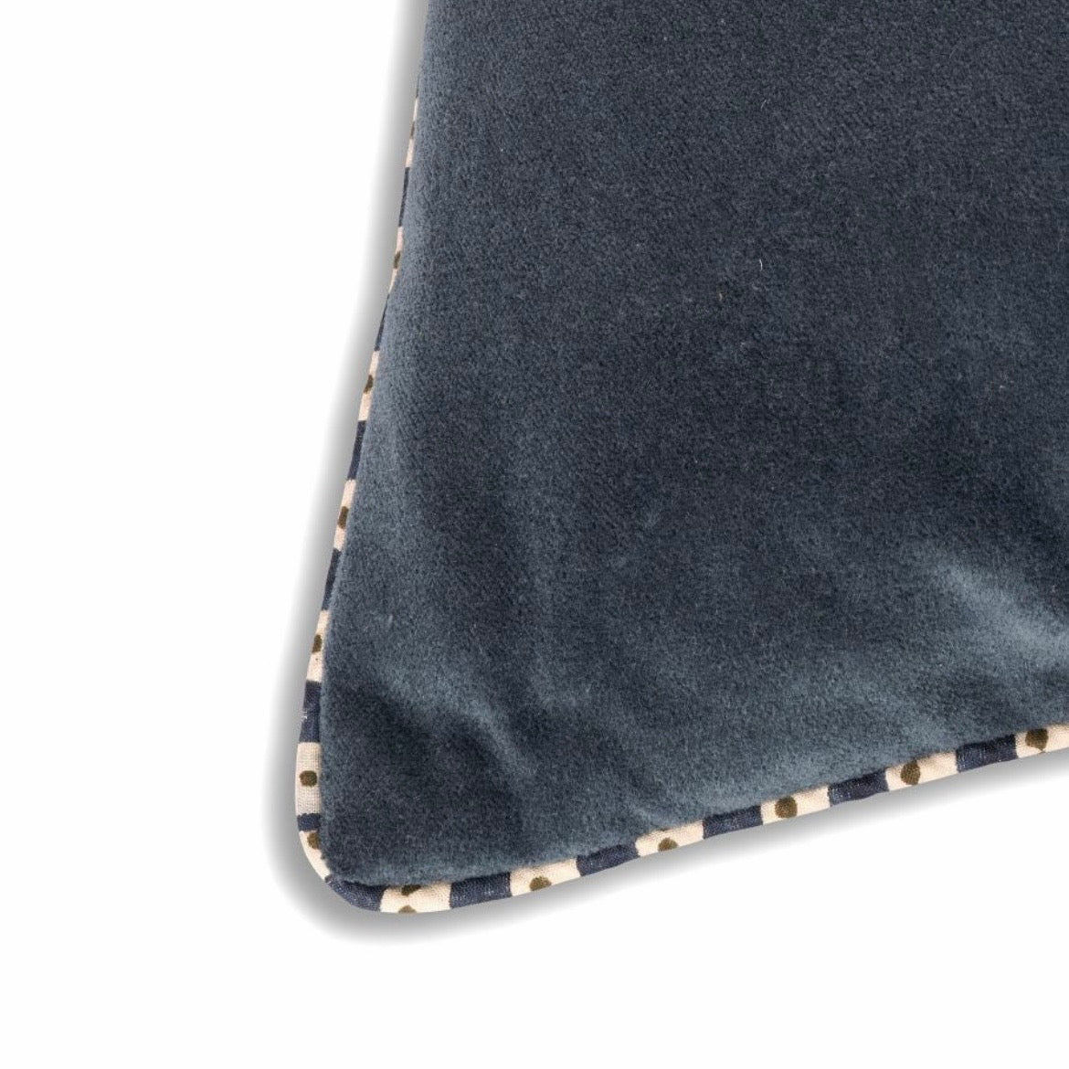 Trés chic. Yuki Madagascar Edimbourg pude er vendbar. På den ene side en lækker bomuld i grafiske håndtrykte striber i blå toner og på den anden side en lækker dybblå velour. Puden har en elegant piping. En yderst eksklusiv pude fra Le Monde Sauvage.