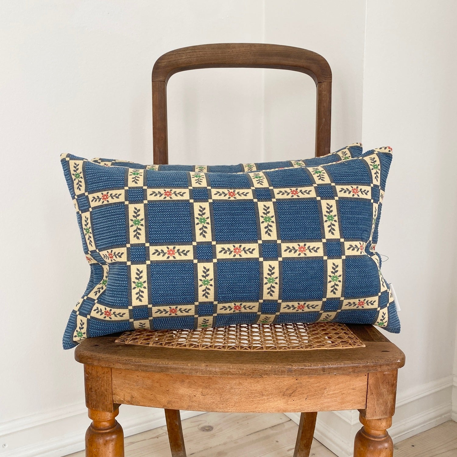 Smuk pude fra Roomers & Woodbox´s Limited Collection syet i eksklusivt vævet tekstil fra Spanien. Afdæmpede blå farver med hint af rød og grøn.