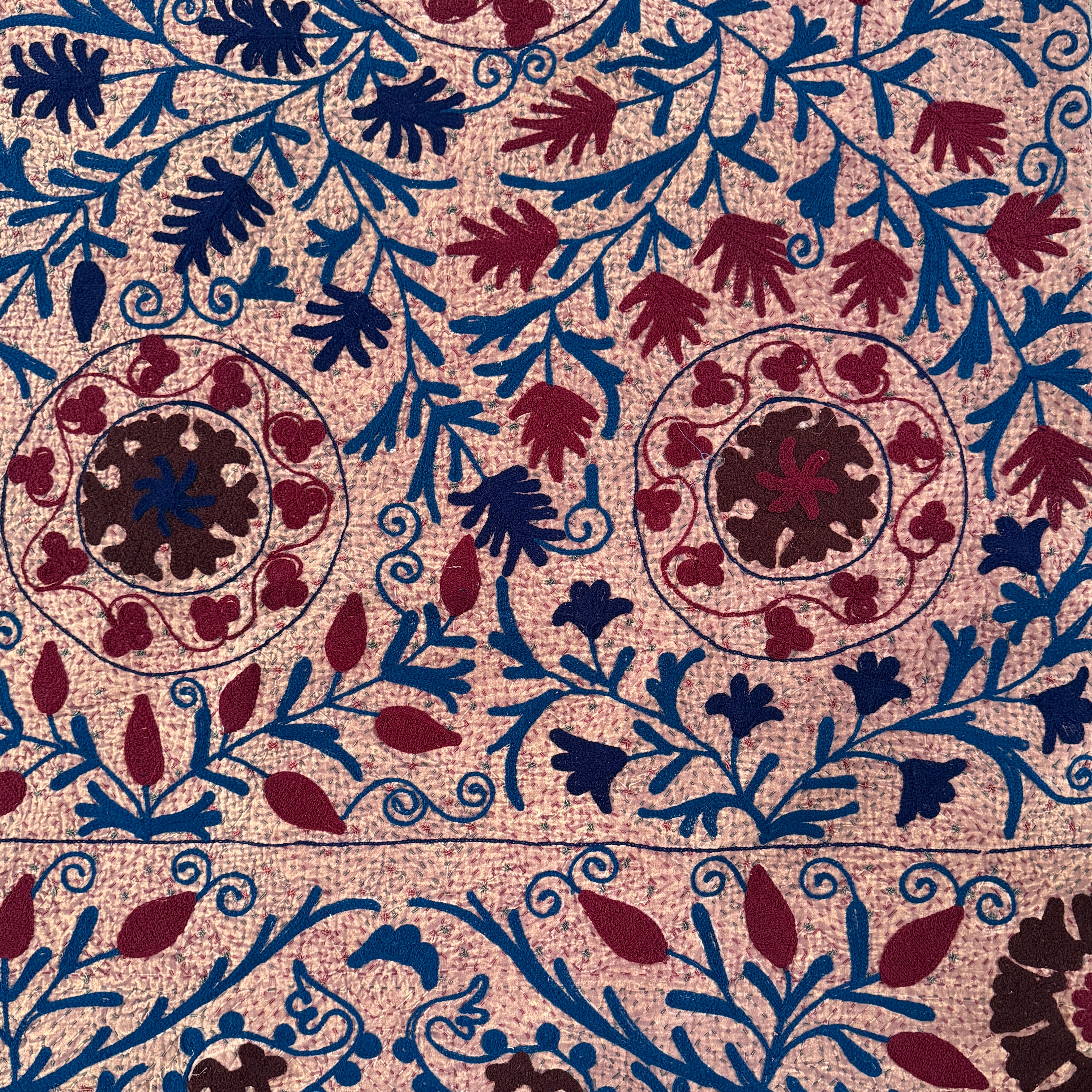 Suzani tæppet passer til en king size bed. Tæppet er også meget dekorativt på en day bed eller som dug. Der er mange muligheder med dette smukke håndbroderede unika tæppe.