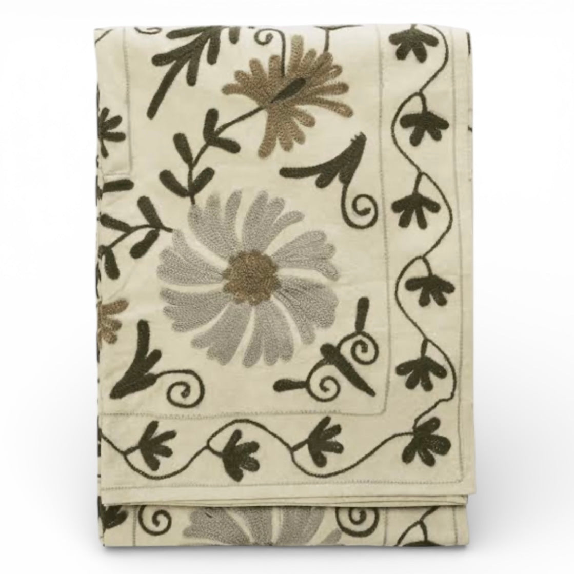 Smukt håndbroderet suzani tæppe i afdæmpede farver fra Det danske brand Madam Stoltz.
