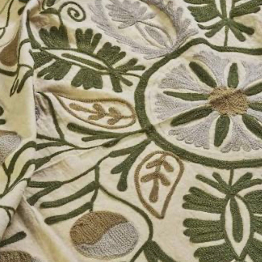 Dette Suzani broderede bomuldstæppe, fremstillet i Indien, fremviser bomuld af høj kvalitet med indviklet broderi i ecru, grønne og grå nuancer. Det smukke tæppe forbedrer enhver indretningsstil og tilbyder et strejf af kunstnerisk sans og tekstur med sit design inspireret af gamle teknikker.
