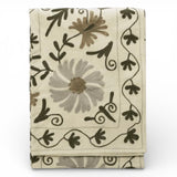 Dette Suzani broderede bomuldstæppe, fremstillet i Indien, fremviser bomuld af høj kvalitet med indviklet broderi i ecru, grønne og grå nuancer. Det smukke tæppe forbedrer enhver indretningsstil og tilbyder et strejf af kunstnerisk sans og tekstur med sit design inspireret af gamle teknikker.