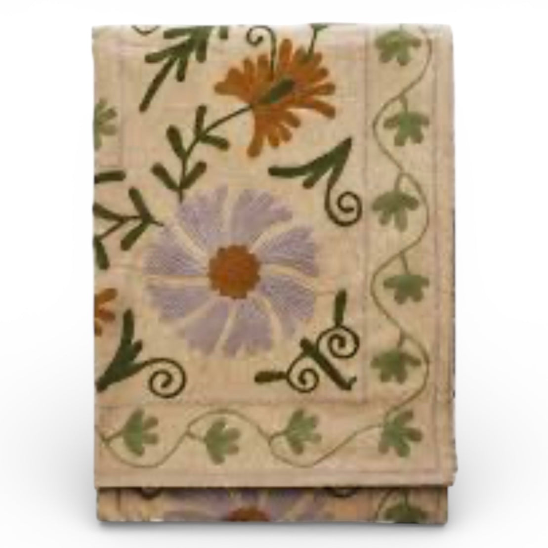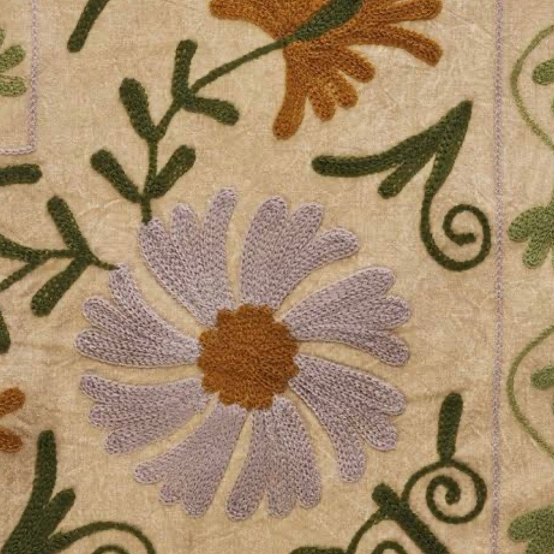 Smukt håndbroderet suzani tæppe i afdæmpede farver fra Det danske brand Madam Stoltz.