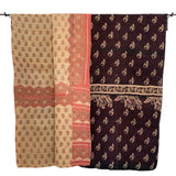Saritæpper er vintage / up cycled og fremstår med patina. Små lapper og reparationer er en del af tæppernes charme og personlighed. Tæpperne er forskellige på de to sider, og du får to tæpper i et med disse smukke saritæpper.